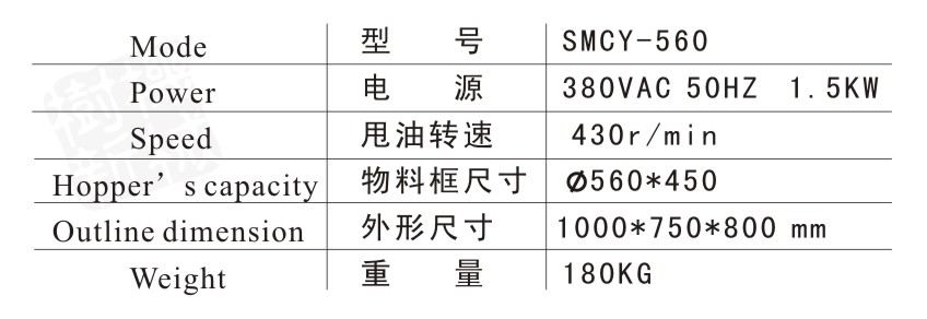 - 此甩油机与SMC-645成型机和SMCJ-35搅拌机配套使用,利用离心力,去除掉瓜或花生油炸好后的残留油份.配套的两个物料框可以直接用于油炸时使用. 配套成型机使用时,刚好半袋瓜子25斤炸一次,甩一次油,这样循环操作